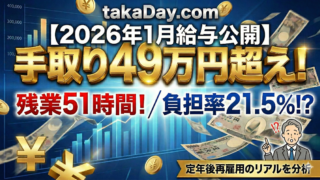 60歳定年後再雇用で働いている「たかゆー」です!今回は2026年1月の給与明細を赤裸々に公開します!今月は、前月(2025年12月)に頑張った「残業51時間」という数字がダイレクトに反映され、なかなか見応えのある金額になりました。しかし、そ...