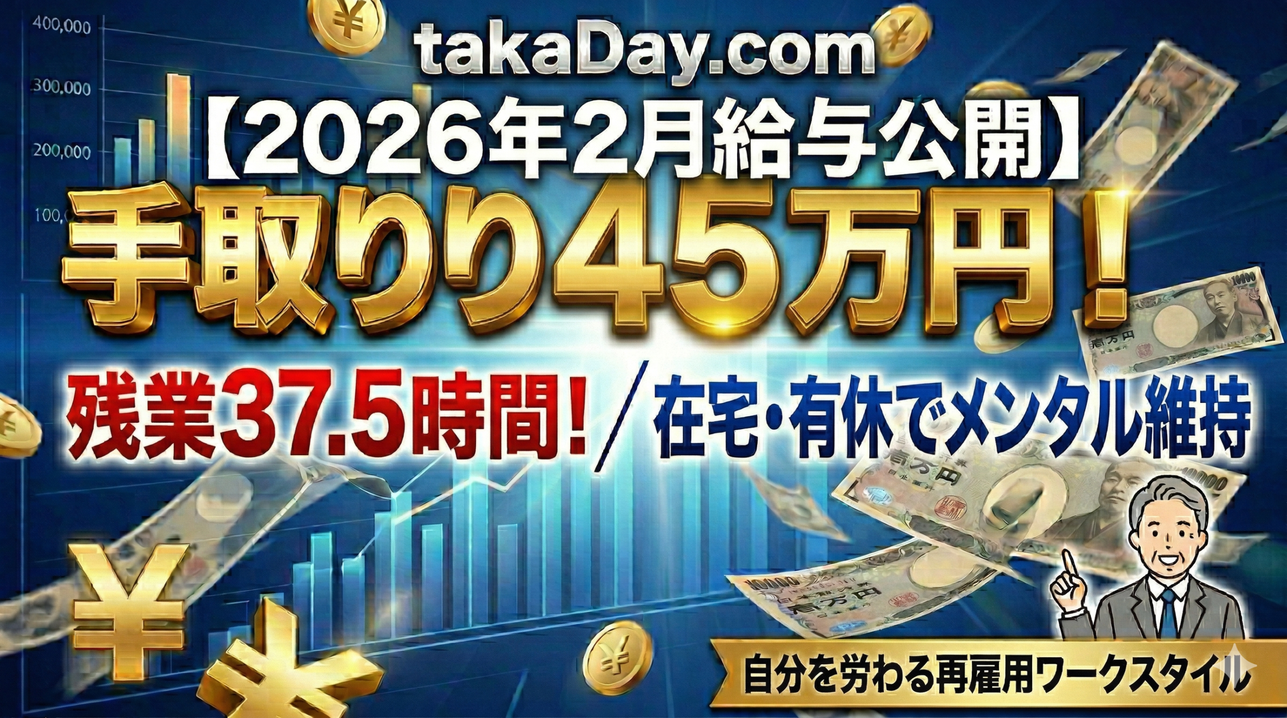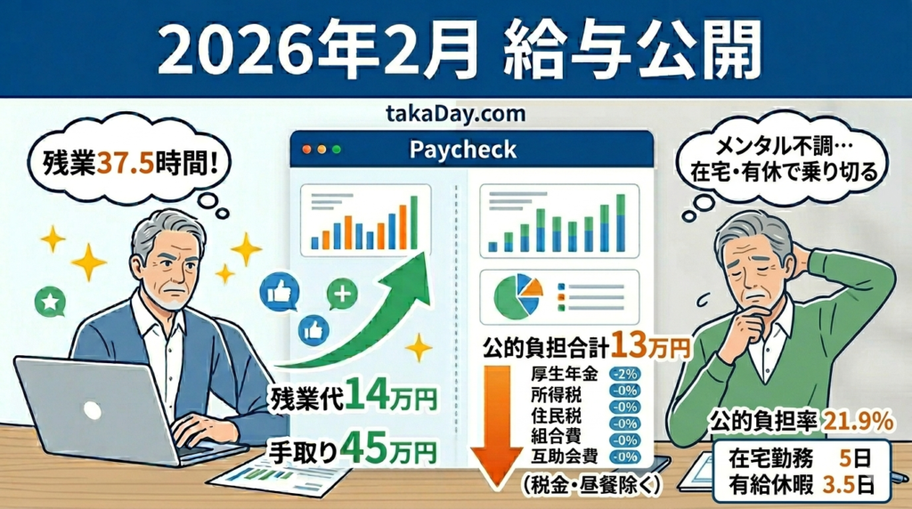 2026年2月の給与は、有休とテレワークに助けられながら、残業代の恩恵も受けて手取り45万円という結果でした。